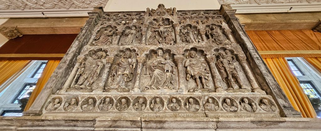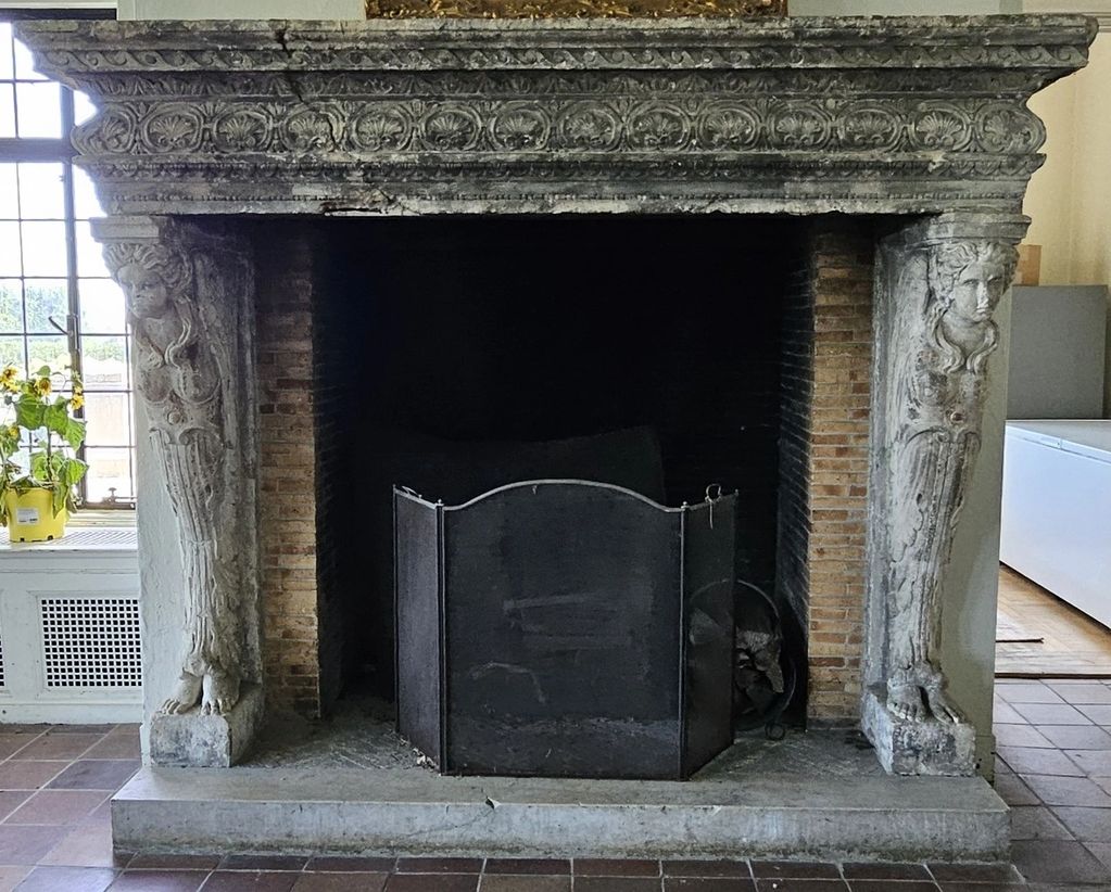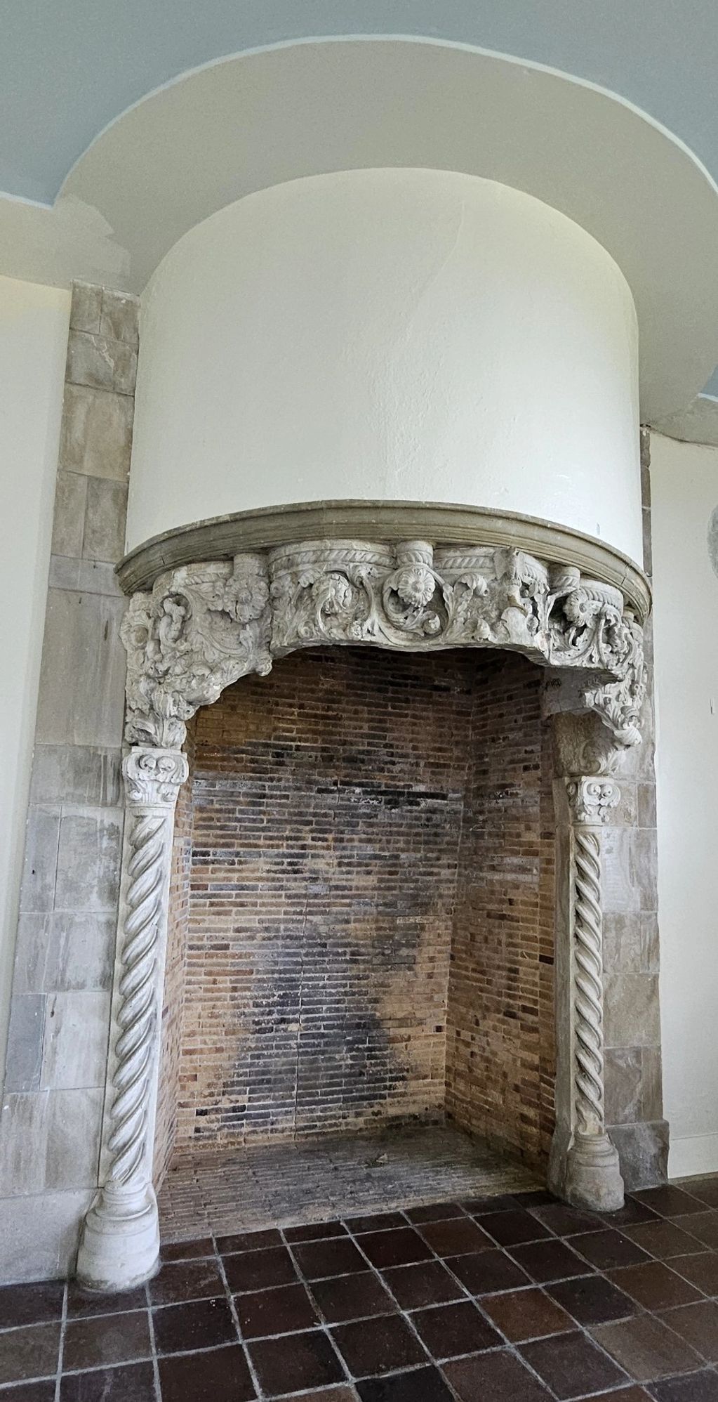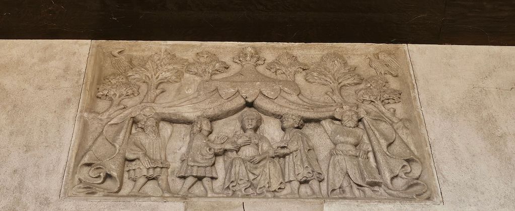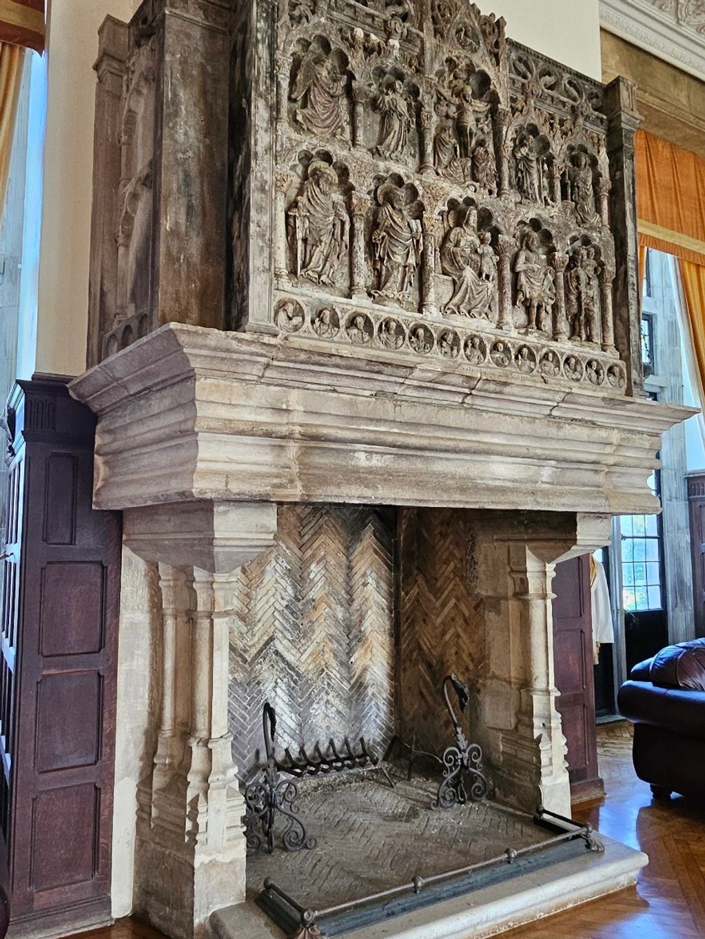 15th Century fireplace relief depicting the crucifixion of Christ and Mother Mary and the apostles.